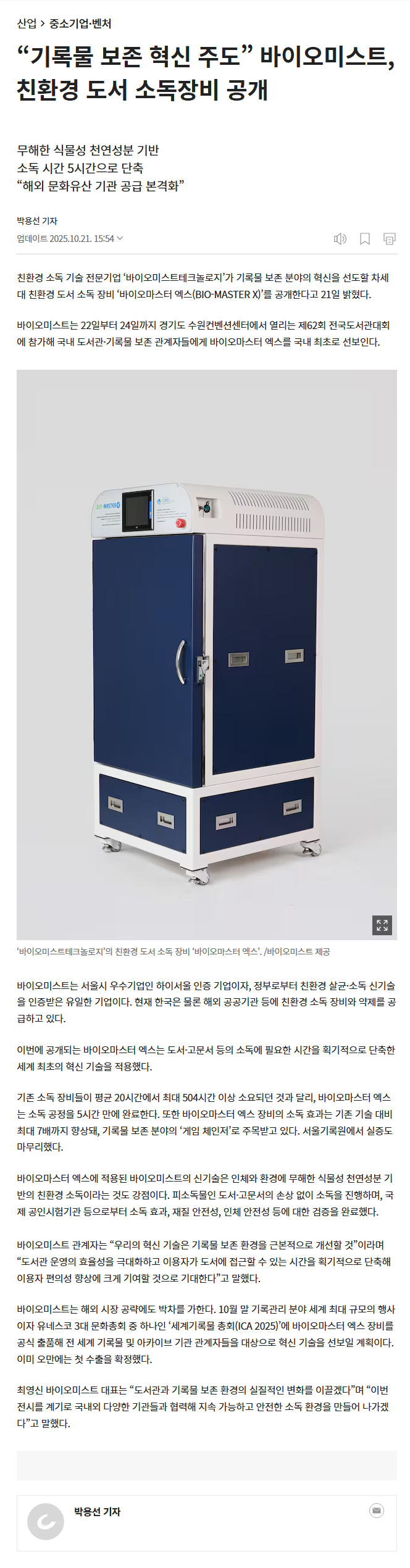 [조선비즈] “기록물 보존 혁신 주도” 바이오미스트, 친환경 도서 소독장비 공개