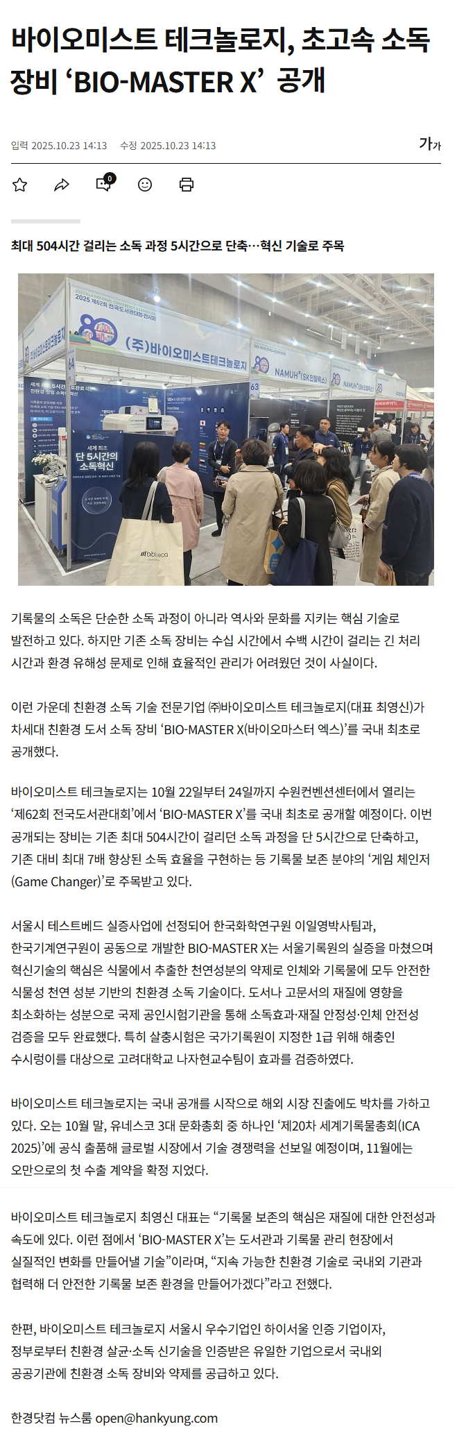 [한경닷컴] 바이오미스트 테크놀로지, 초고속 소독 장비 ‘BIO-MASTER X’ 공개