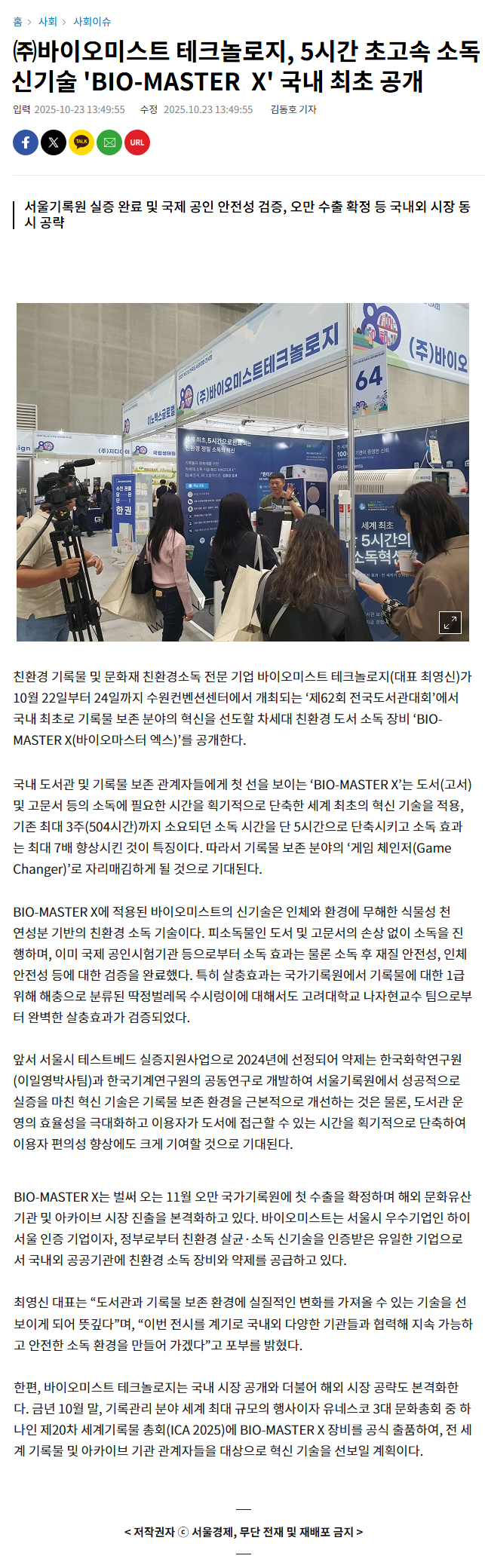[서울경제] ㈜바이오미스트 테크놀로지, 5시간 초고속 소독 신기술 'BIO-MASTER X' 국내 최초 공개
