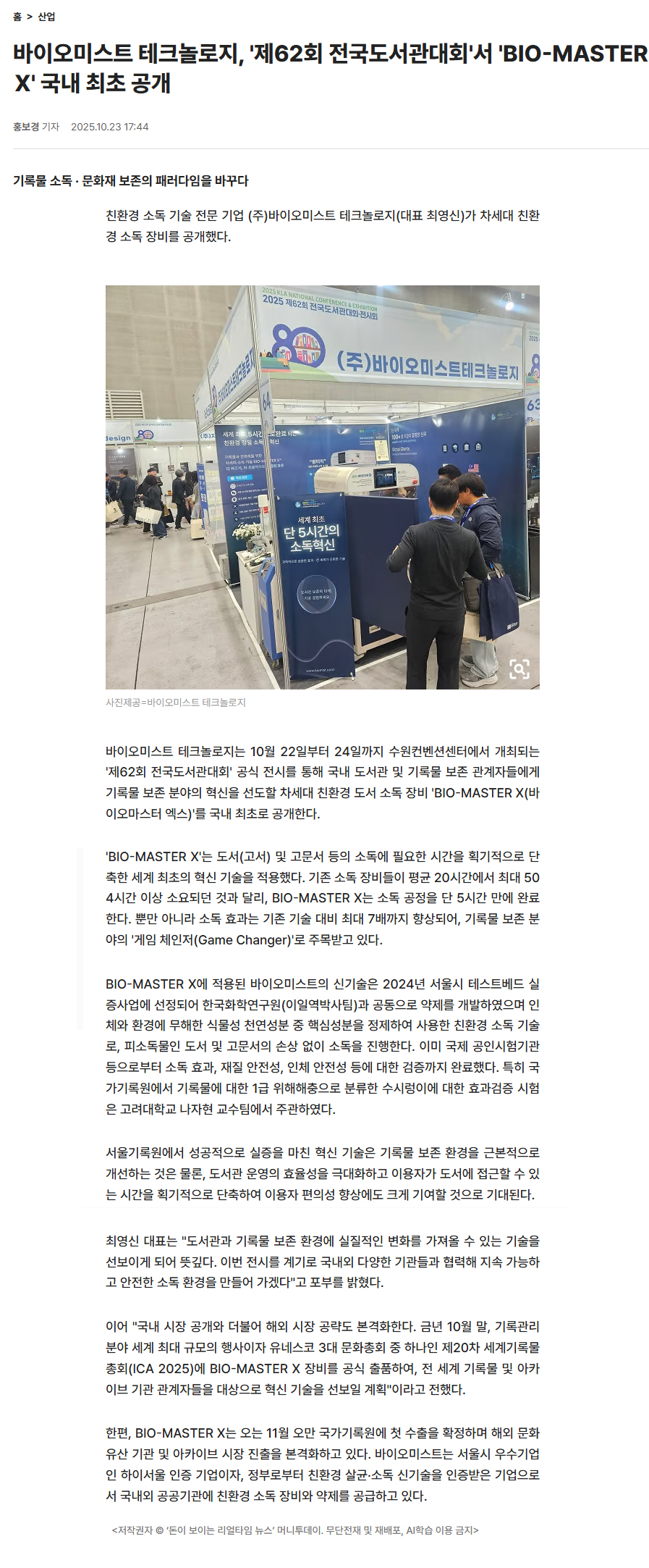 [머니투데이] 바이오미스트 테크놀로지, '제62회 전국도서관대회'서 'BIO-MASTER X' 국내 최초 공개
