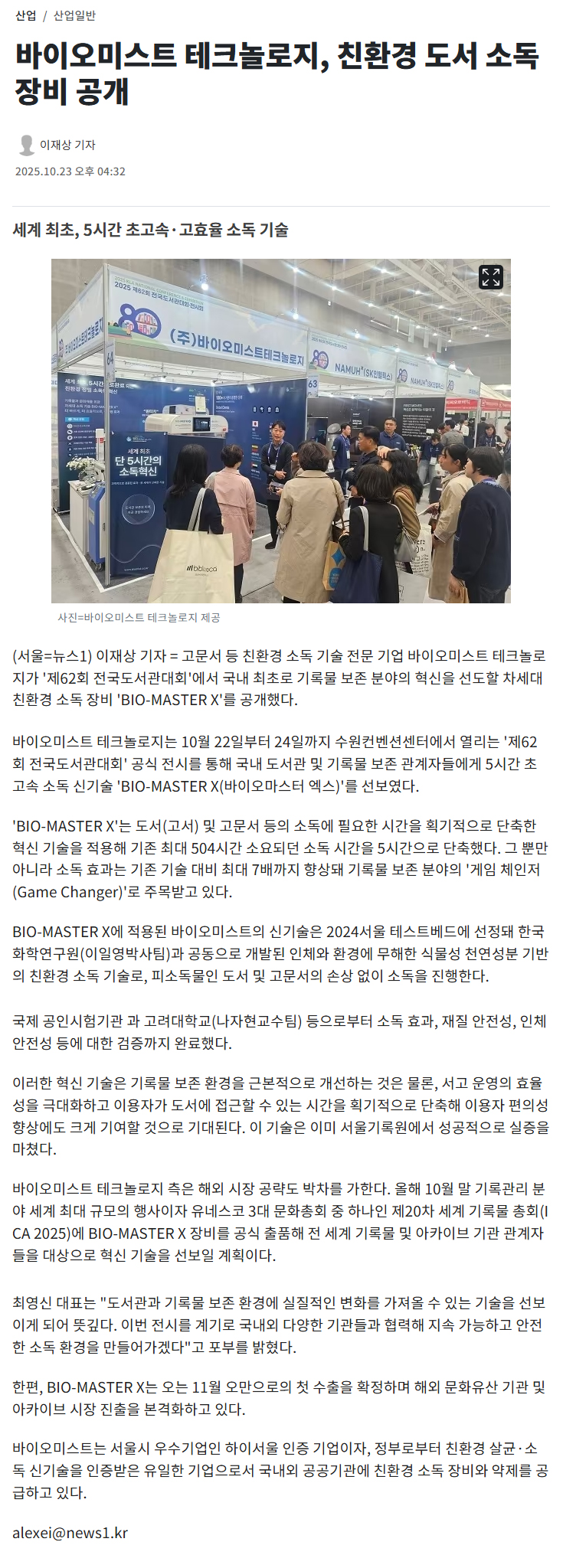 [뉴스1] 바이오미스트 테크놀로지, 친환경 도서 소독 장비 공개